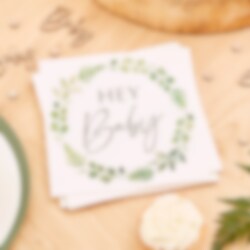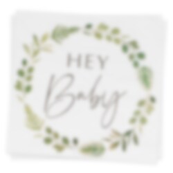 16 umweltfreundliche Servietten in Grün und Weiß mit Motiven des Textes "Hey Baby". Perfekt für die Babyparty oder Taufe. Die Servietten hat 2-lagen und ist 33 x 33 cm entfaltet.