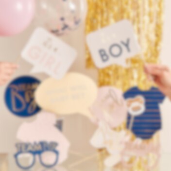 10 Foto Requisiten in schönen Farben mit verschiedenen Baby-Motiven. Sie und Ihre Gäste können damit während der Gender Reveal-Party lustige Fotos machen.