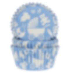 50 blaue Muffinförmchen mit schönem Babymotiv. Backen Sie damit schöne Muffins oder Cupcakes für die Babyparty. Der Bodendurchmesser der Muffinförmchen beträgt ungefähr 5 cm.