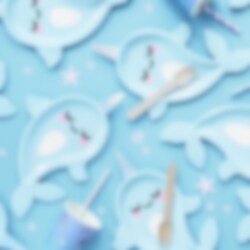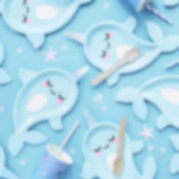 6 Pappteller in der Form eines blauen kleinen Narwals. Ein wirklich süßes Accessoire für die Kinderparty. Die Teller sind etwa 18,5 x 29 cm groß.