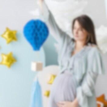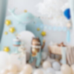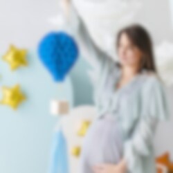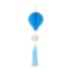 Wabendekoration, die einen Heißluftballon in blauen Farben darstellt. Die Dekoration besteht aus Papier und ist 90 cm hoch.