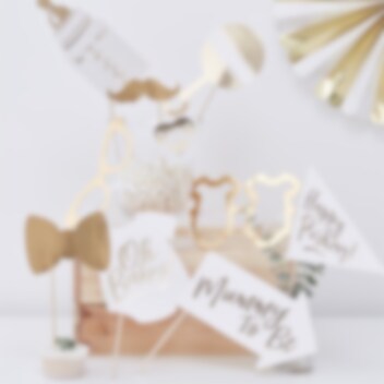 10 Stück Foto Requisiten in Weiß und Goldfolie mit Motiven verschiedener Dinge rund ums Baby. Verwenden Sie diese, um während der Babyparty schöne und unvergessliche Fotos zu gestalten.
