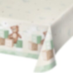 Schöne Tischdecke aus Papier mit Motiven eines süßen Teddybären und Babyklötzen. Die Tischdecke hat eine Größe von 137 x 259 cm.