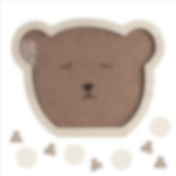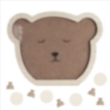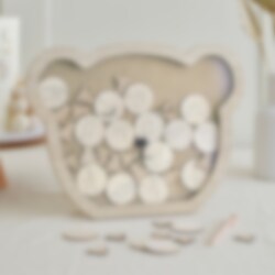 Das Gästebuch hat einen Holzrahmen in Form von einem Teddybärgesicht, in den die Gäste Holzmarken als Glückwünsche einlegen können. Der Rahmen ist 28 cm hoch, 36,5 cm breit und 1,5 cm tief. Es kommt mit 18 runden Holzmarken und 20 bärenförmigen Holzmarken, perfekt zum Schreiben von Grüßen darauf.