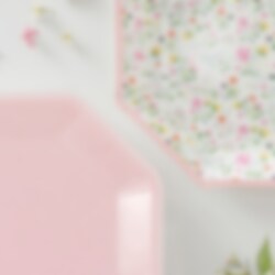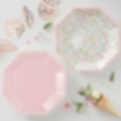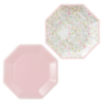 8 Papp-Teller in 2 verschiedenen Ausführungen, 4 Teller sind in Hellrosa, während die anderen 4 Teller Blumenmotive haben. Die Teller haben einen Durchmesser von etwa 23 cm.