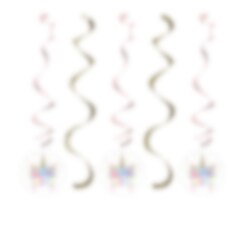 5 hängende Dekorationen, davon 3 mit Roségold-Spiralen und Einhornmotiven in Pastellfarben und 2 mit goldfolierten Spiralen. Wirklich schöne Dekorationen zum Aufhängen für die Babyparty mit Einhornmotiv. 3 der Dekorationen sind etwa 76 cm lang und 2 davon sind etwa 99 cm lang.