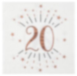 10 weiße Servietten mit roségold glitzernden Mustern und der Zahl "20". Diese Servietten sind sehr dekorativ, wenn Sie für eine 20. Geburtstagsfeier eindecken. Die Servietten haben 3 Lagen und fühlen sich luxuriös an. Größe 16,5 x 16,5 cm.