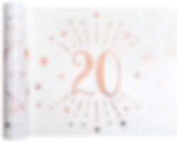 Schöner Tischläufer, der mit dekorativen Mustern in Roségold und den Zahlen "20" glitzert. Dieser Tischläufer kommt in einer praktischen Rolle und ist 30 cm breit und ganze 5 Meter lang. Es reicht für mehrere Tische und eine große 20. Geburtstagsfeier. Das Material ist 100% Polyester.