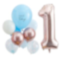 Stilvolles Ballon Bouquet in Blau und Roségold mit einem 1-Jahres-Motto. Dekorieren Sie damit den Raum für die 1.Geburtstagsparty, um ihn besonders festlich zu gestalten. Das Paket enthält