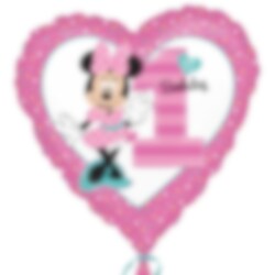 Wunderschöner herzförmiger Folienballon mit Motiven von Minnie Maus. Eine schöne Dekoration für die 1. Geburtstagsparty. Der Ballon hat im aufgeblasenen Zustand einen Durchmesser von 43 cm.