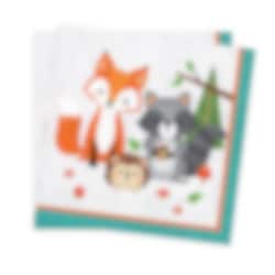 16 Servietten in den Farben Weiß, Grün/Blau und Orange mit Motiven von Waldtieren aus dem niedlichen Thema Waldtiere. Die Servietten hat 2-lagen und ist 33 x 33 cm entfaltet.