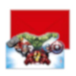 6 Einladungskarten mit Motiven der legendären Superhelden Iron Man, Captain America, Hulk und Thor aus den Avengers. Perfekt zum Versenden an Freunde, um sie zu einer lustigen Superheldenparty einzuladen.