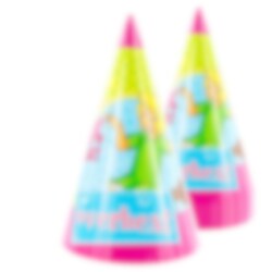 10 lustige Partyhüte mit Motiven von Bibi Blocksberg. Die Hüte bestehen aus Papier und werden mit einem Kordelzug befestigt.