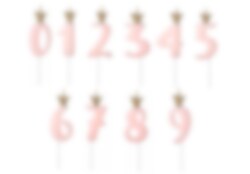Ausgefallene Tortenkerzen zum Dekorieren des Kuchens oder anderer Backwaren. Die Tortenkerzen sind hellrosa mit einer goldglitzernden Krone an der Spitze. Kombinieren Sie nach Belieben, denn die Kerzen sind in den Zahlen 0-9 erhältlich.