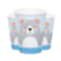 8 Pappbecher in Grau-, Weiß- und Blautönen mit niedlichen Bärenmotiven. Verwenden Sie diese Becher, wenn es Zeit für eine Kinderparty mit Bären-Motto ist. Die Becher sind 10 cm hoch und fassen etwa 266 ml.