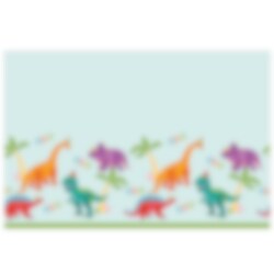 Gestalten Sie eine verspielte und farbenfrohe Tischdekoration mit dieser Dinosaurier-Tischdecke, die den Geburtstagstisch schnell in eine aufregende Dschungelwelt verwandelt. Die fröhlichen Dinosaurier, die Palmen und die kleinen "ROAR"-Details verleihen eine lebendige Atmosphäre, die perfekt zu einem gelungenen Kindergeburtstag passt.
