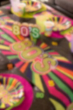 Ein supercooler Tischläufer in schönen kräftigen Farben und mit dem Text 80's. Superschön auf den Tisch zu stellen, wenn es Zeit ist, den Tisch für die Mottoparty oder Disco-Kinderparty zu decken.