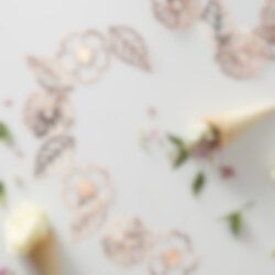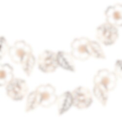 Exklusive Girlande mit 18 Motiven von Blumen und Blättern in schöner Roségoldfolie. Eine beeindruckende Dekoration für die Kinderparty, Feier oder Babyparty. Die Girlande ist etwa 3 Meter lang.