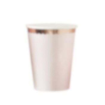 8 wunderschöne Pappbecher in Hellrosa mit roségoldfolierten Rändern. Die Becher sind etwa 10 cm hoch und fassen etwa 270 ml.