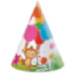 6 Stück Partyhüte aus Pappe mit Motiven von bunten Ballons und verschiedenen lustigen Tieren. Die Hüte sind etwa 19 cm hoch und werden mit einem Gummiband befestigt.
