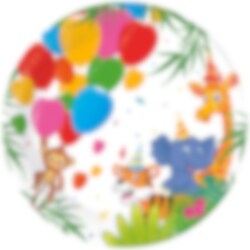 8 Pappteller mit niedlichen und bunten Motiven von Dschungeltieren und Luftballons. Die Teller haben einen Durchmesser von 23 cm und sind aus FSC-zertifiziertem Papier hergestellt.