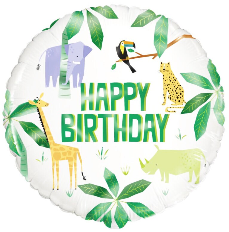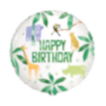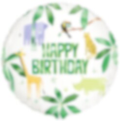 Hübscher Folienballon mit niedlichen Motiven von kleinen Safaritieren und grünen Blättern mit dem Text "Happy Birthday". Ein lustiges Accessoire zum Dekorieren, wenn es Zeit für eine Kinderparty ist. Passt perfekt zu unseren anderen Accessoires aus dem Thema Safaritiere.