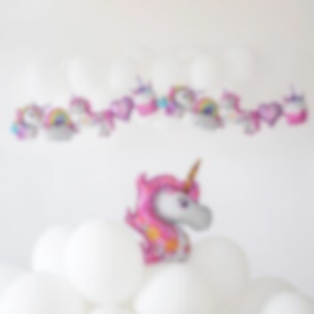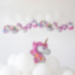 Wunderschöne Ballonggirlande mit Einhornmotiven – perfekt für eine Einhorn-Mottoparty! Die Girlande ist 206 cm lang, und jeder Ballon hat eine Höhe von 34 cm. Die Ballons verfügen über ein selbstschließendes Ventil und lassen sich leicht mit einer Ballonpumpe oder dem beiliegenden Strohhalm aufblasen.
