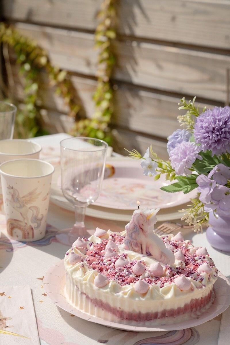 Die Kerze schmückt jede Geburtstagstorte und ist ein zauberhafter Blickfang für Kinder, die Einhörner, Regenbogenfarben und fantasievolle Themen mögen. Die Kerze ist 7 x 7,5 cm groß.
