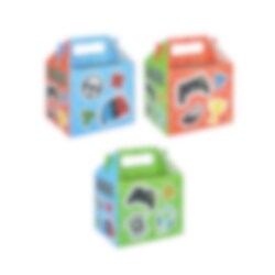 Coole Geschenkboxen mit drei verschiedenen Gaming-Party-Motiven. Perfekt, um darin Süßigkeiten und Spielzeug für die Kinderparty zu verstauen. Die Geschenkboxen ist aus Pappe und lässt sich leicht zusammenfalten.