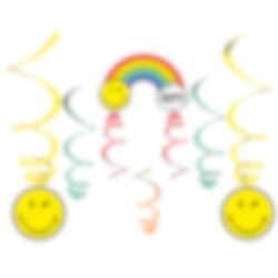 Hängende Dekorationen in verschiedenen Farben mit Motiven lustiger Smileys. Hängen Sie diese über den Partytisch oder an die Wand, wenn eine Smiley-Kinderparty stattfindet.