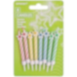 8 Tortenkerzen in schönen Farben mit Sternen oben drauf. Die Tortenkerzen sind etwa 8 cm hoch.