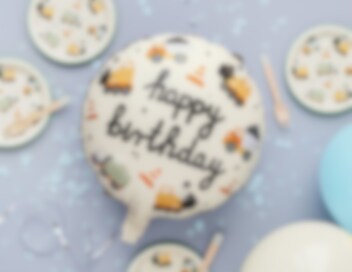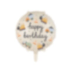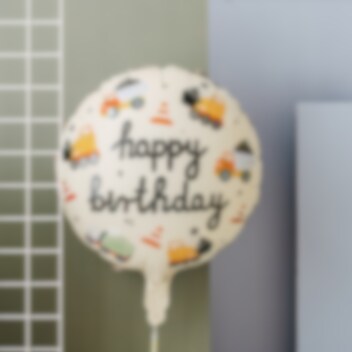 Stilvoller Folienballon mit coolen Fahrzeugmotiven. Der Ballon hat den Text "Happy" aufgedruckt.