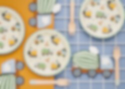 6 Kuchenteller in herrlichen Farben mit verschiedenen Motiven von Arbeitsfahrzeugen. Für diejenigen, die sich für Fahrzeuge und Baustellen interessieren, sind diese Kuchenteller eine offensichtliche Wahl für eine süße Themenparty.