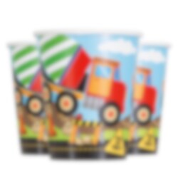 8 coole Pappbecher mit dem verspieltem Motiv eines großen Zementlastwagens auf einer Baustelle mit Verkehrsschildern. Perfekt, wenn es Zeit ist den Tisch für eine Feier im Fahrzeuge-Motto zu decken.