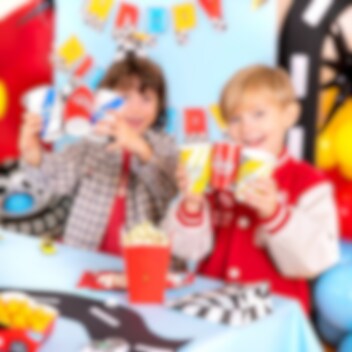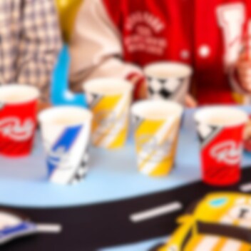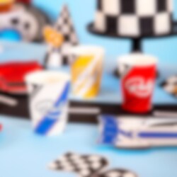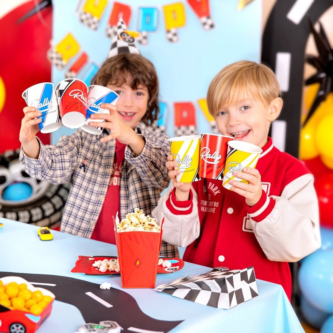 6 Pappbecher mit aufregenden Rally Championship-Motiven in Gelb, Weiß und Rot. Perfekt, wenn Sie eine einheitliche und spaßige Tischdekoration für die Geburtstagsfeier mit Racing Car-Thema haben möchten.