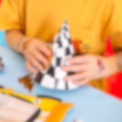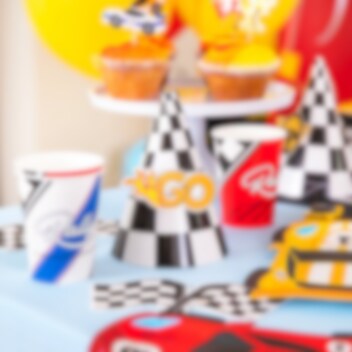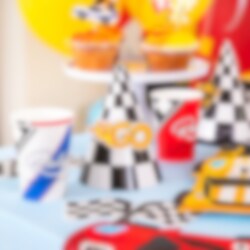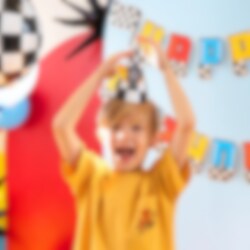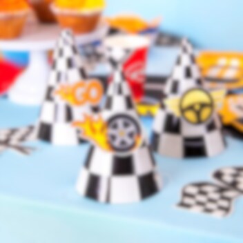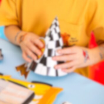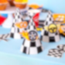 6 Partyhüte im klassischen karierten Racing-Muster, perfekt zum Aufsetzen, wenn der kleine Rennfahrer Geburtstag hat! Die Hüte werden einfach zusammengesetzt und mit den mitgelieferten bedruckten Papierdekorationen im Racing-Thema verziert, die mit Klebepunkten befestigt werden.