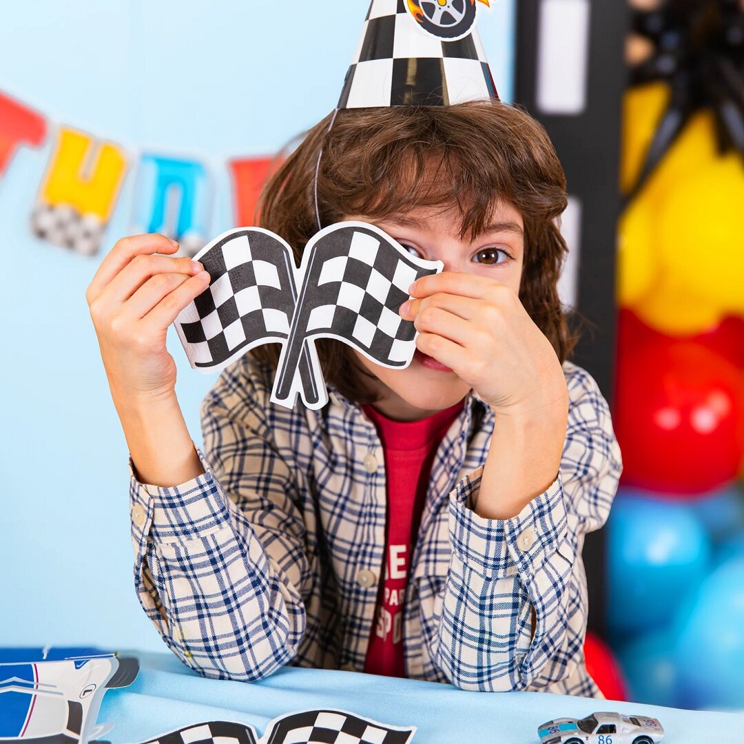 12 Servietten in Form einer klassischen schwarz-weißen Zielflagge. Perfekt, wenn Sie eine einheitliche und rasante Tischdekoration für die Geburtstagsfeier mit Racing Car-Thema haben möchten.