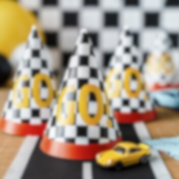 6 Partyhüte im Rennwagen-Thema mit coolen Motiven der Zielflagge bei Autorennen. Die Hüte sind 16 cm hoch und werden mit Gummibändern befestigt.