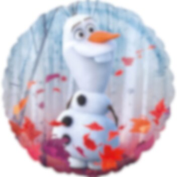 Folienballon mit Motiven auf beiden Seiten von Anna, Elsa und Olaf in einem Winterwald mit bunten Blättern aus dem Film Frozen 2. Eine ausgefallene Dekoration für die Frozen-Party. Der Ballon hat im aufgeblasenen Zustand einen Durchmesser von etwa 45 cm und wird mit Helium oder Luft aufgeblasen.