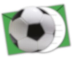 6 Einladungskarten in Form von Fußbällen. Die Karten sind etwa 10 x 10 cm groß und alle möglichen Texte sind auf Englisch. 6 grüne Briefumschläge sind im Lieferumfang enthalten.