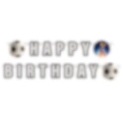 Girlande aus Pappe in fröhlichen Farben mit Fußballthema und dem Text "Happy Birthday". Die Girlande ist 180 cm lang und die Buchstaben sind etwa 13,5 cm hoch.