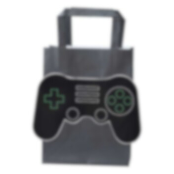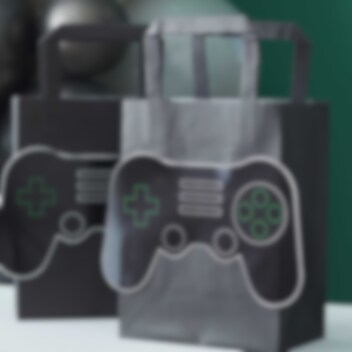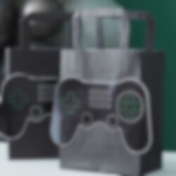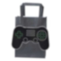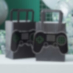 5 Geschenktüten aus Papier in schwarzer Farbe mit 3D-Motiven von schwarzen Gamecontrollern auf der Außenseite. Füllen Sie diese Taschen mit etwas Gutem und einer Überraschung und geben Sie die Taschen Ihren Gästen auf der Party. Die Geschenktüten sind ohne Henkel etwa 20 x 15 cm groß.