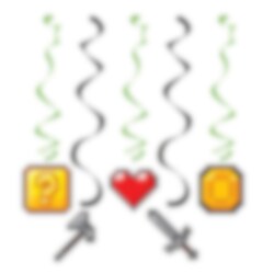 5 Hängedekorationen aus Papier und Folien-Spiralen mit schönen Videospielmotiven. Eine lustige Dekoration für die Videospiele-Mottoparty. 3 davon sind etwa 72 cm lang und 2 weitere sind etwa 99 cm lang.