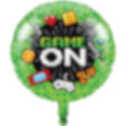 Ausgefallener Folienballon in Grün und Schwarz. Der Ballon hat coole Videospielmotive und den Text "Game on“ in der Mitte. Eine schöne Dekoration für die Kinderparty. Der Ballon hat im aufgeblasenen Zustand einen Durchmesser von etwa 45 cm. Kann mit Luft oder Helium gefüllt werden.