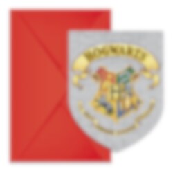 6 Einladungskarten mit Motiven des Hogwarts-Wappens aus Harry Potter. Laden Sie damit die Gäste zu einer magisch lustigen Harry-Potter-Party ein.