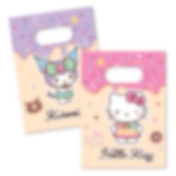 4 Geschenktüten aus Papier in fröhlichen Farben mit süßen Motiven von Hello Kitty und Kuromi. Perfekt, um sie mit Süßigkeiten, Mitgebsel kleinen Spielzeugen oder lustigen Überraschungen zu füllen, die die Kinder nach der Kinderparty mit nach Hause nehmen können.