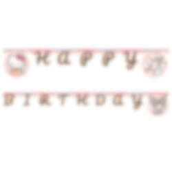 Lustige Girlande aus Papier mit dem Text "Happy Birthday" und Motiven von Hello Kitty. Die Girlande ist 2 Meter lang.
