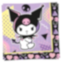 20 Servietten mit coolem und farbenfrohem Motiv von Kuromi vor einem lila und schwarzen Hintergrund mit Herzen und Totenköpfen. Perfekt wenn Sie eine einheitliche und coole Tischdekoration für die Geburtstagsfeier mit Kuromi-Thema gestalten möchten.