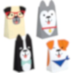 8 Geschenktüten aus Papier mit Motiv 4-tlg. verschiedene Hunde. Füllen Sie die Tüten mit Süßigkeiten und verschiedenen Spielzeaugen und geben Sie diese dann während der Party an die Gäste. Die Geschenktüten sind etwa 20 x 11 cm groß.