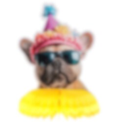 Der Hund mit Sonnenbrille und Partyhut macht zusammen mit dem farbenfrohen Waben-Element die Dekoration zu einem verspielten Blickfang auf dem Tisch.